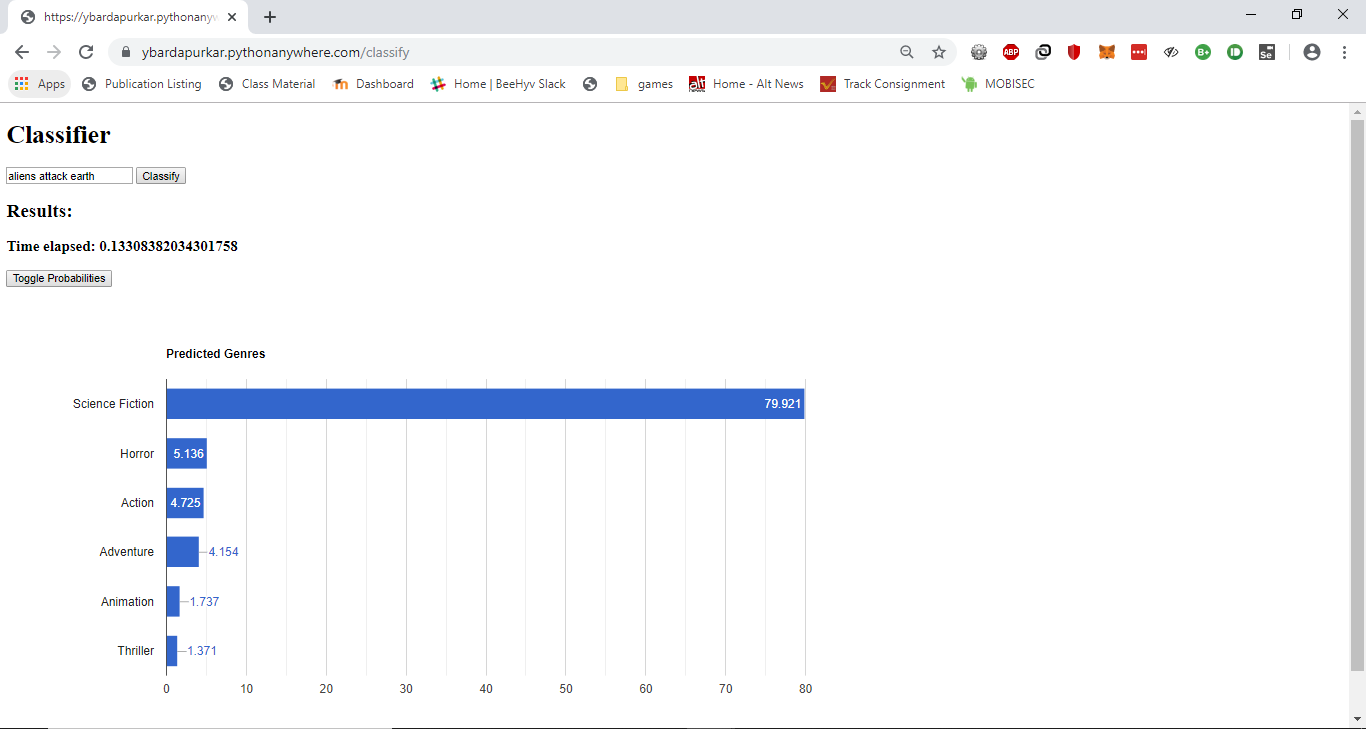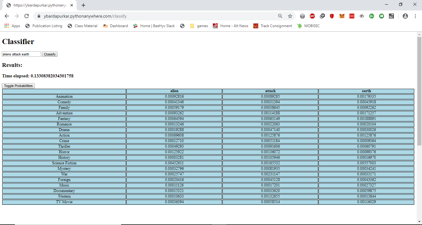 First, the query entered by the user is tokenized, and for each query token, the probability of the token belonging to each genre is calculated. Then, probability of the query belonging to the genres is calculated, using Naive Bayes.