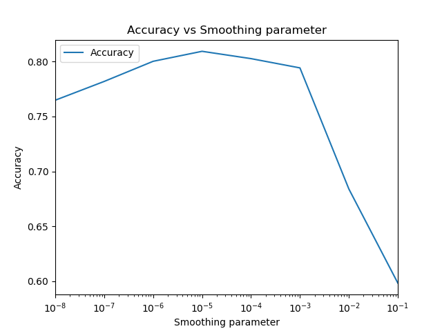 I tried different smoothing parameters in the range [0.00000001 , 0.1] and calculated the accuracy using the above formula. For my dataset and accuracy calculation, I happened to achieve highest accuracy (0.8092) at smoothing parameter = 0.00001